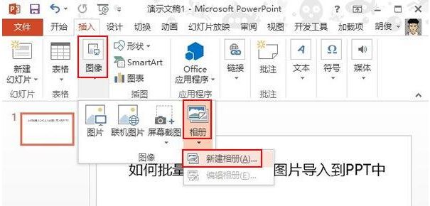如果是ppt2013的話則可以:可以先單擊菜單欄--插入--圖像--相冊(cè)--新建相冊(cè)來(lái)進(jìn)行操作添加: