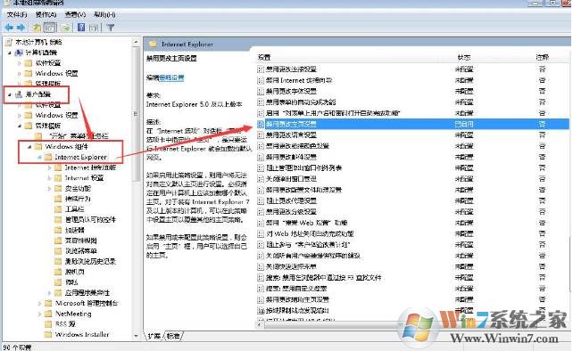 2、進(jìn)入組策略后如圖依次打開——用戶配置——管理模板——Windows 組件——Internet Explorer ,在右邊找到“禁用更改主頁設(shè)置”選項