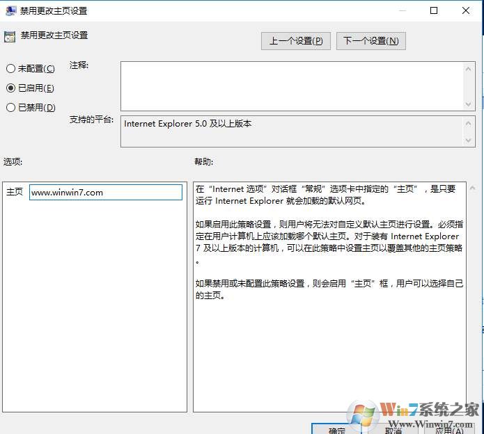 3.雙擊打開禁用更改主頁設(shè)置,在里面如下圖點擊“已啟用”在下方輸入你要設(shè)置的主頁鏈接如 m.cncxm.com,點擊確定。