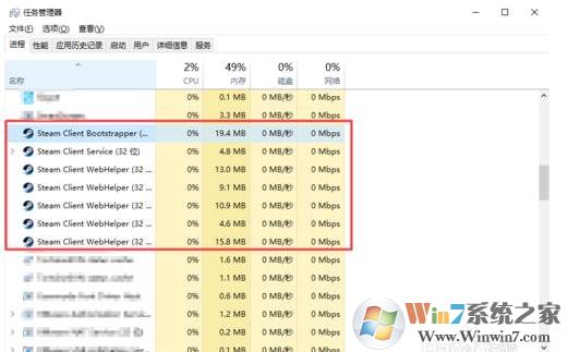 2、然后在進(jìn)程中找找steam有關(guān)的進(jìn)程,全部結(jié)束掉;