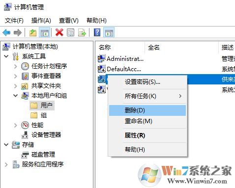 2、登錄admin賬戶后我們將新建的普通用戶刪除,方法:在 此電腦 上單擊鼠標(biāo)右鍵,選擇【管理】,在左側(cè)依次點擊【本地用戶和組】--【用戶】,在右側(cè)將之前的用戶賬戶刪除;