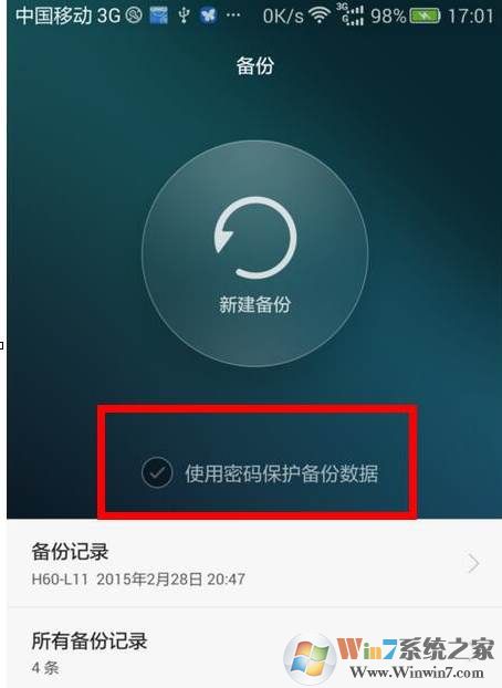 2、這里以華為手機為例進行演示操作,首選打開備份軟件!如果有密碼保護選項,把他去掉,這里要不需要密碼保護,要不然就會看不到wifi密碼了!