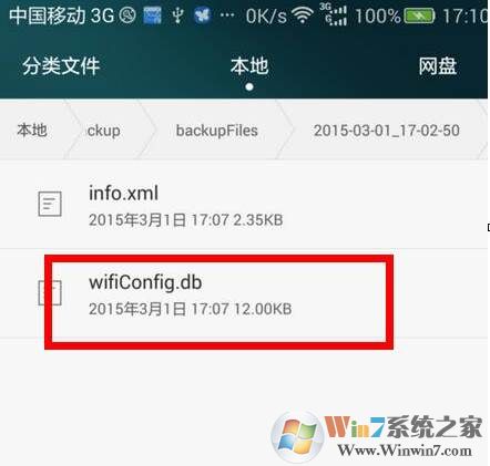 7、在這里可看一個叫wificonfig.db的文件,這里就保存了wifi密碼的數據,這個類型的格式的我們不便于打,直接重命名為txt,查看即可??!