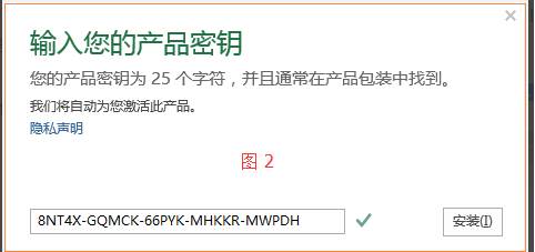 2、在跳出的對話框中,輸入提供的密鑰 (如圖2),點(diǎn)擊安裝。