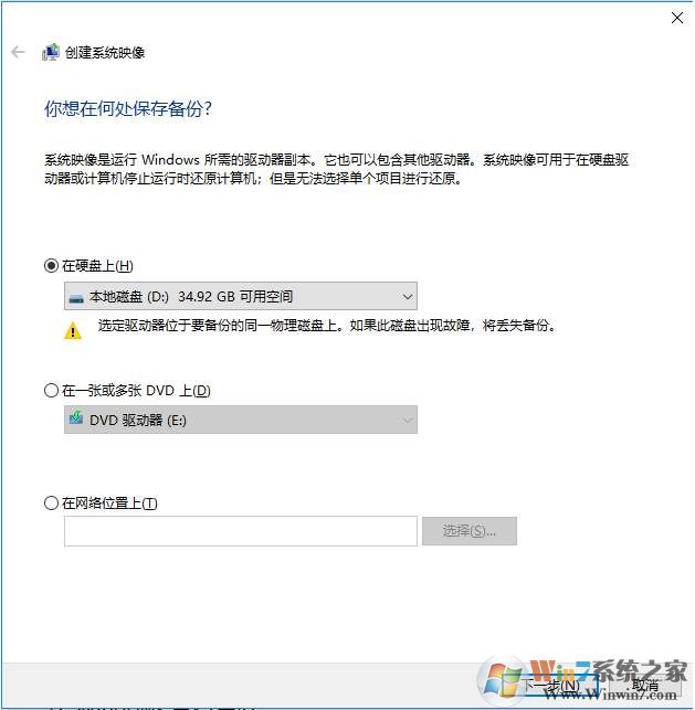 1、選擇系統(tǒng)備份文件的存儲(chǔ)位置,可以選擇另一塊硬盤的任意分區(qū)(系統(tǒng)推薦),也可以選擇同一塊硬盤的另外一個(gè)分區(qū)(比如D盤)(大部分人只有一塊硬盤,別無選擇了:-))