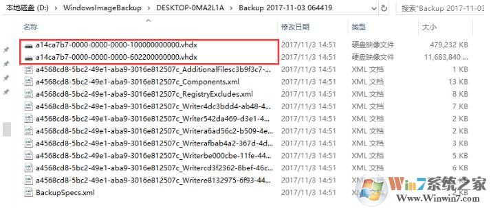 6、備份完成后,我們還要核對(duì)一下備份的文件,按照你選擇的備份地址,“WindowsImageBackup”目錄就是備份文件的保存目錄,那2個(gè)“vhdx”文件就是備份的核心文件了。