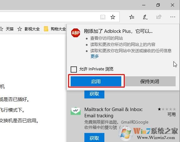 5、安裝完成后, 回到Microsoft Edge瀏覽器就會看到提示,點擊“啟用”廣告屏蔽插件即可