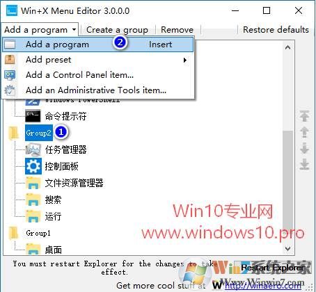 2、Win+X Menu Editor窗口中顯示有三個(gè)分組Group的程序功能菜單,這三個(gè)分組正對應(yīng)于開始按鈕右鍵菜單被兩條橫線分割的三塊區(qū)域。如果想把“控制面板”和“設(shè)置”這對前后輩冤家放在一起,讓它們和平共處起來,所以就選擇“Group2”。