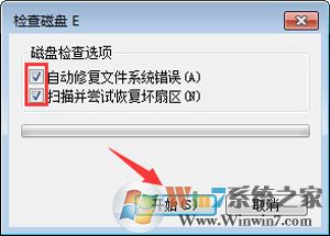 2、在彈出的“檢查磁盤”對話框中同時選中“自動修復(fù)文件系統(tǒng)錯誤”和“掃描并嘗試恢復(fù)壞扇區(qū)”兩項,點擊“開始”執(zhí)行修復(fù)操作。