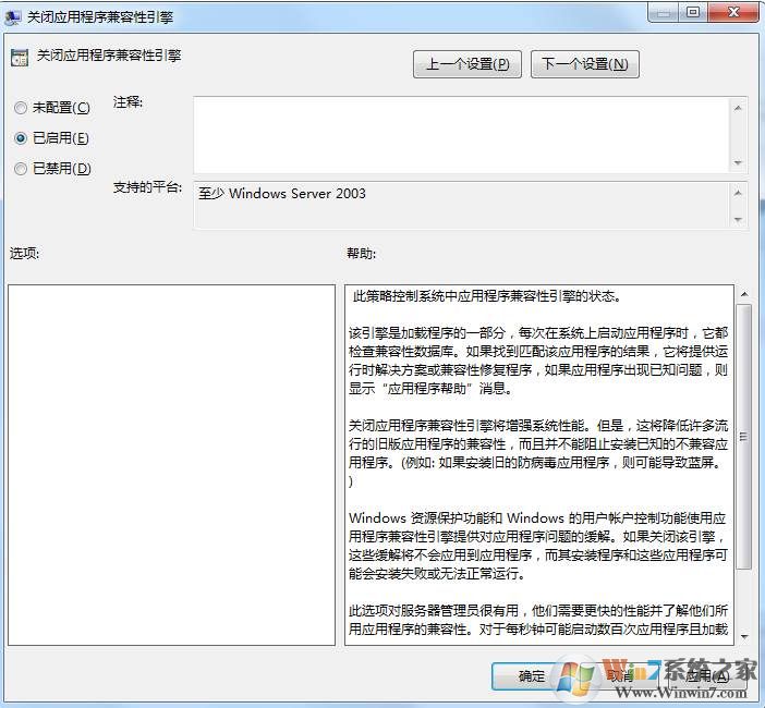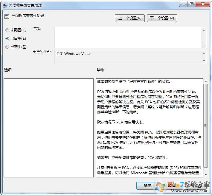 4、在找到關閉程序兼容性助理----雙擊----未配置改為 ---已啟用 ,然后應用確定;
