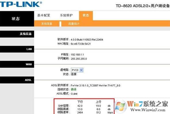 1、如果ADSL Modem只是作為橋接模式接入,先通過在ADSL Modem WEB頁面中查看線路衰減、SNR裕量(該值正常情況下為15-40db,如果低于10db,表明當(dāng)前線路質(zhì)量不夠好)、線路速率等參數(shù),如果這些參數(shù)存在異常,請(qǐng)致電服務(wù)商檢查線路;狀態(tài)參數(shù)可以在我司產(chǎn)品的WEB配置界面中查到,以TD-8620為例,見下圖: