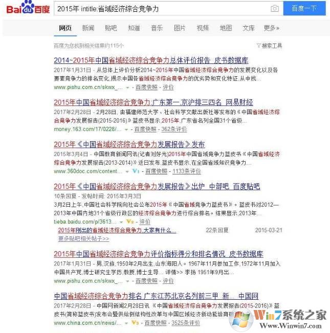 例如:關(guān)鍵詞“省域經(jīng)濟(jì)綜合競爭力”一定會包含在搜索結(jié)果的標(biāo)題中,而intitle之前的“2015年”則可能在標(biāo)題中,也可能在正文中出現(xiàn)。
