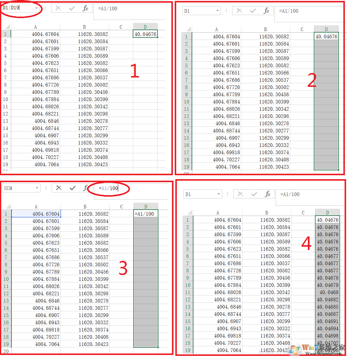 公式編輯欄輸入要復(fù)制的公式(A1/100),名稱框輸入需要填充的范圍 (比如 E1: E19) 然后回車 鼠標(biāo)移動(dòng)到公式編輯欄 ,同時(shí)按 CTRL+回車鍵輸入即可