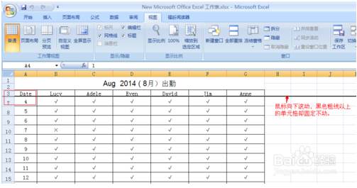 6、凍結(jié)窗口后,鼠標向下滾動,箭頭所指直線以上的單元格就固定不動了。