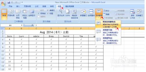 8、如果我們想把這些設置取消,同樣在菜單欄點擊“視圖”,然后是“凍結(jié)窗格”→“取消凍結(jié)窗格”,這樣剛才的設置就取消了。