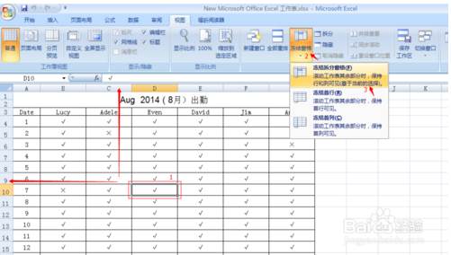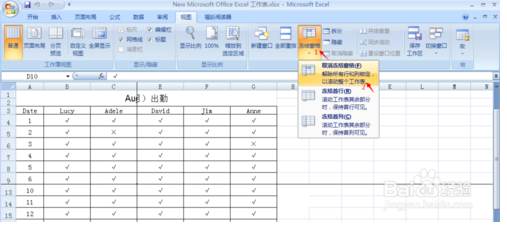 5、如果我們想凍結(jié)窗口的某幾行某幾列窗口,鼠標向下滾動時這些行和列怎樣都固定不動呢? 下面我們就以凍結(jié)第九行第C列的窗口為例。鼠標點擊選中D10單元格,在菜單欄點擊“視圖”→“凍結(jié)窗格”→“凍結(jié)拆分窗格”。也就是說,點擊你需要凍結(jié)的第幾行第幾列單元格的下一行下一列單元格的交集。