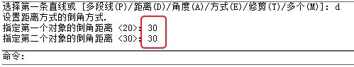步驟二:此時(shí)彈出菜單中有距離和角度。我們選擇輸入“D”距離命令,然后輸入第一條線距離30,第二條線距離也是30,如圖所示: