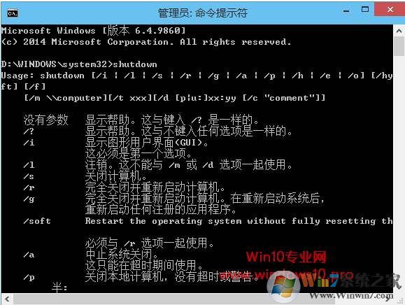 1、WN+X打開命令提示符(管理員),然后在輸入關(guān)機(jī)命令shutdown,回車,即可查看到shutdown命令的用法及參數(shù)說明。如圖:
