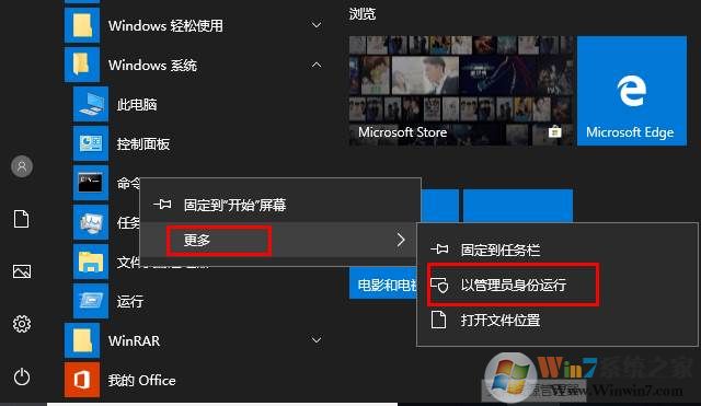 2、找到命令提示符,右鍵——更多——以管理員身份運(yùn)行;