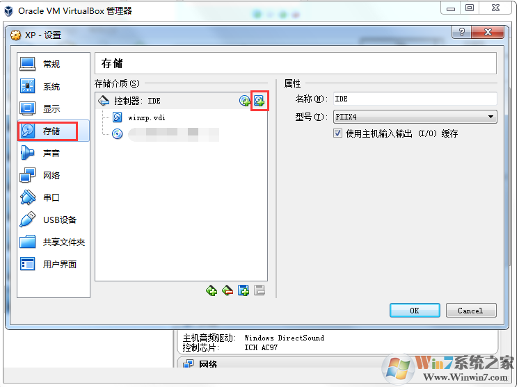 8、打開(kāi)儲(chǔ)存后,在控制器IDE 后面點(diǎn)擊 加號(hào);Win7系統(tǒng)之家m.cncxm.com