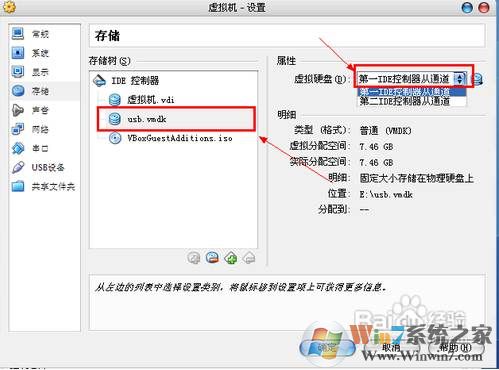 11、打開(kāi)后usb.vmdk就會(huì)自動(dòng)添加到的虛擬機(jī)里面,然后在右邊的虛擬硬盤(pán)那“擇第一IDE控制器從通道”,選擇好后,點(diǎn)確定即可!win7系統(tǒng)之家 m.cncxm.com