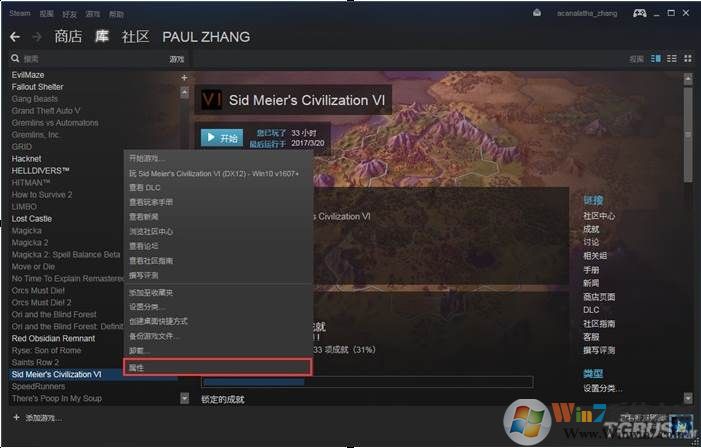1、我們以《文明6》為例,在游戲庫中找到游戲,右鍵點擊游戲,選擇屬性。