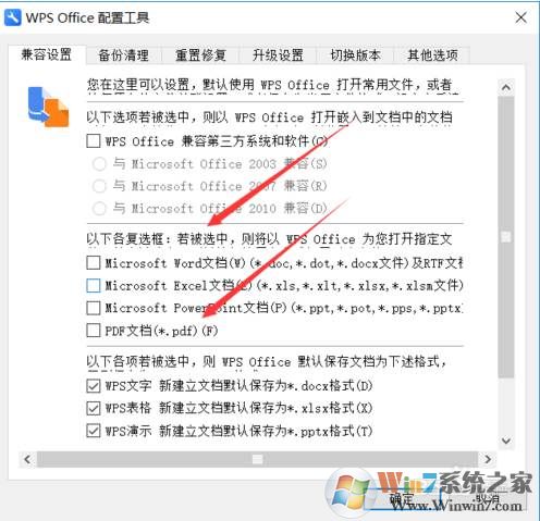 3、在wps office配置工具里的【兼容設(shè)置】選項(xiàng)卡里可以看到wps關(guān)聯(lián)offic文件沒有勾選,如下圖所示。