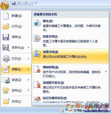 1、打開Excel2007,單擊左上角的“Office按鈕”,然后選擇“準(zhǔn)備”,在彈出的列表中點(diǎn)擊“加密文檔”即可對(duì)表格進(jìn)行加密。