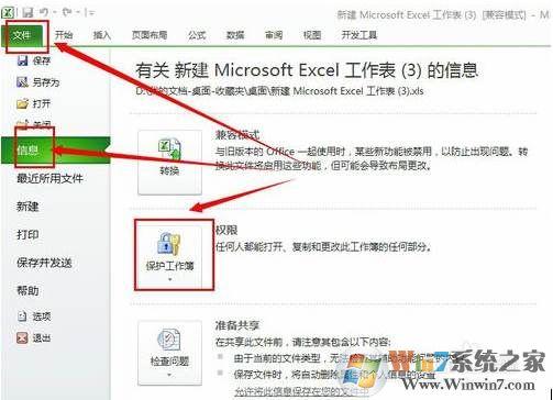 1、打開Excel2010文件后,我們選擇“文件”--“信息”--“保護(hù)工作簿”,如下圖所示。
