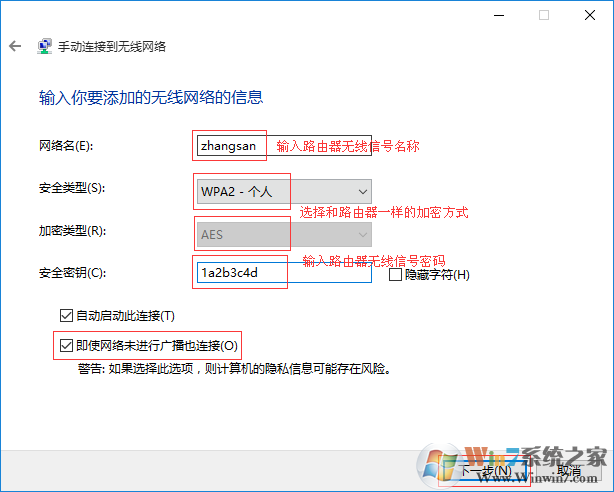 3、手動(dòng)輸入路由器的SSID、無線密碼等參數(shù),勾選 即使網(wǎng)絡(luò)未進(jìn)行廣播也連接,點(diǎn)擊 下一步,如下圖: