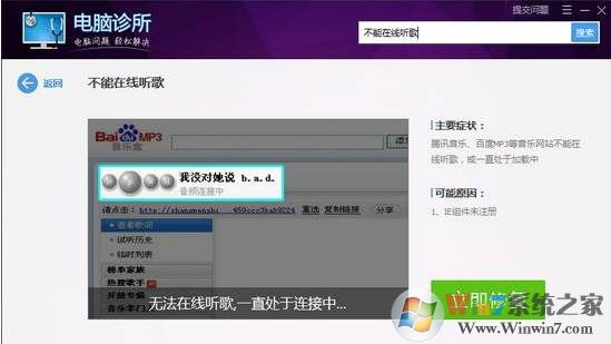 4、如里還是不能解決,那么在QQ電腦管家里的 電腦診所中,搜索“不能在線聽歌” 并立即修復(fù)
