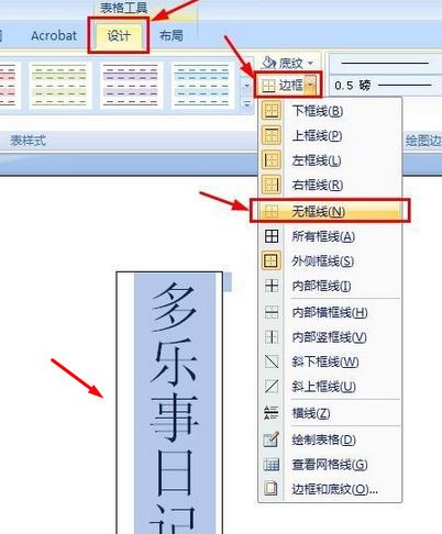 5、調(diào)整完畢后切換到菜單欄的“設(shè)計(jì)”選卡,找到“邊框”工具,在下拉列表中,選擇“無框線”,這樣子就可把邊框去掉了,如圖: