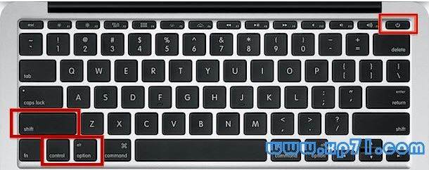 3. 在內(nèi)建鍵盤上,同時(shí)按下(左側(cè))Shift、Control、Option 這三個(gè)鍵和電源按鈕。
