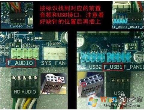 和USB一樣,前置音頻線插頭也是排好了的,找到主板上的AUDIO標(biāo)識(shí)的排針插入即可。