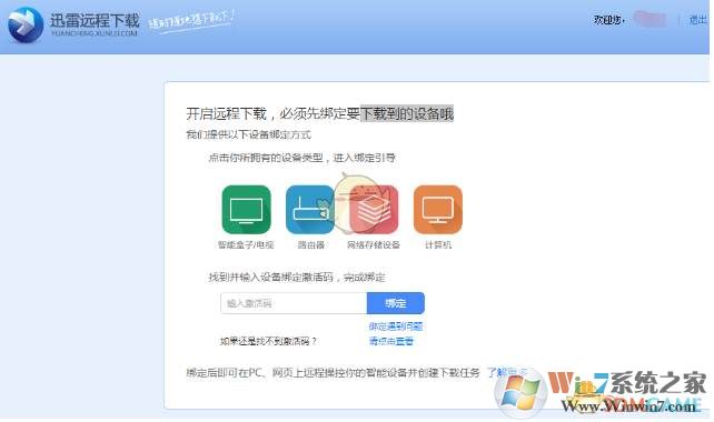 3、打開遠(yuǎn)程下載后迅雷會(huì)提醒我們綁定下載到的設(shè)備,根據(jù)自己情況選擇綁定設(shè)備然后點(diǎn)擊綁定;(綁定說明都有的哦。目前遠(yuǎn)珵下載需要迅雷自身的產(chǎn)品,如下載寶)
