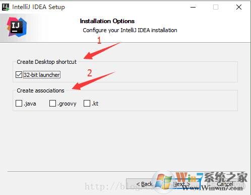 - 標(biāo)注1:表示在桌面上創(chuàng)建一個 IntelliJ IDEA 的快捷方式,這個建議勾選上,不然我們每次啟動 IntelliJ IDEA 都要到安裝目錄下啟動,豈不要累死?