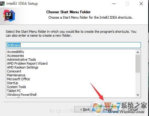 選擇一個“開始菜單文件夾”,這個不用管它,咱們選擇默認(rèn)的“JetBrains”文件夾就可以,點(diǎn)擊“Install”,進(jìn)行安裝: