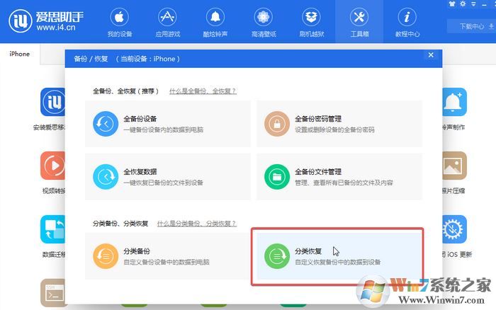 由于從高系統(tǒng)版本降級(jí)的低系統(tǒng)版本是不能“保留用戶資料刷機(jī)”,而且iOS 12全備份設(shè)備無法恢復(fù)到低版本系統(tǒng)中。所以降級(jí)前先在“備份/恢復(fù)”中分類備份手機(jī)內(nèi)的數(shù)據(jù)。如果您在升級(jí)前已備份資料則無需重新備份。