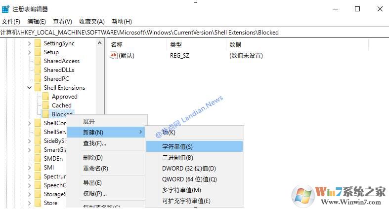 5、接著再把鼠標放到我們新建的Blocked上點擊右鍵然后新建—>字符串值,字符串值的名稱設(shè)置為: