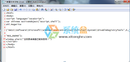 我們還可以利用網(wǎng)頁的文件(.htm)解鎖注冊(cè)表。如圖示在記事本中這樣輸入后另存為擴(kuò)展名為htm的文件,運(yùn)行就ok了。