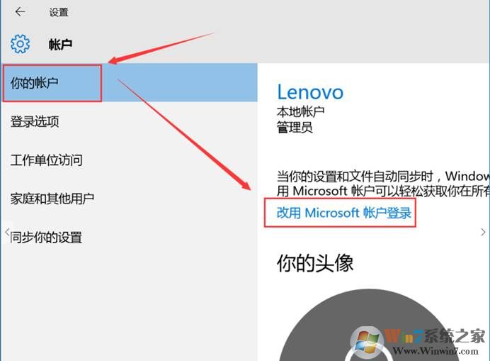 2、 在彈出的設(shè)置頁(yè)面中選擇“你的賬戶”——單擊“改用Microsoft賬戶登錄”,如圖:
