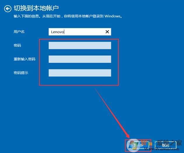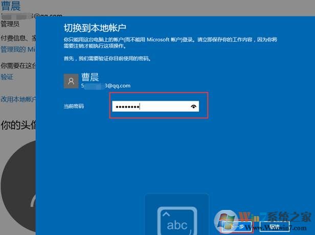 4、 輸入當(dāng)前本地賬戶密碼點(diǎn)擊:“下一步”。切換完成。(如果本地賬戶無(wú)密碼保持空即可)