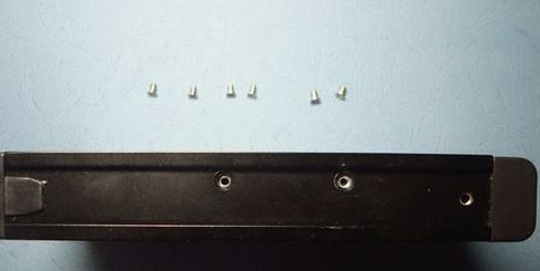 用螺絲起子在硬盤盒上安裝螺絲,注意大螺絲要安裝在硬盤接口處,小螺絲安裝在后面,兩側(cè)的螺絲都安裝好;
