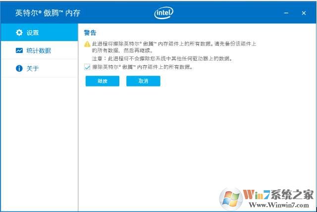 3、出現(xiàn)以下警告,點(diǎn)擊“繼續(xù)”,注意會查出英特爾“傲騰”內(nèi)存組件上的所有數(shù)據(jù),并重新啟動電腦;