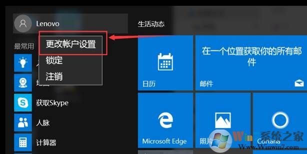 1、 點擊Win10左下角的開始菜單,點擊上面的帳戶頭像——選擇“更改賬戶設(shè)置”,如圖: