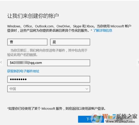 3、 在窗口中輸入賬戶信息及微軟賬戶的密碼,選擇“下一步”,如圖: