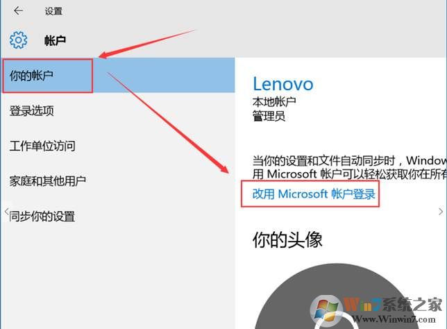 2、 在彈出的設(shè)置頁面中選擇“你的賬戶”——單擊“改用Microsoft賬戶登錄”,如圖: