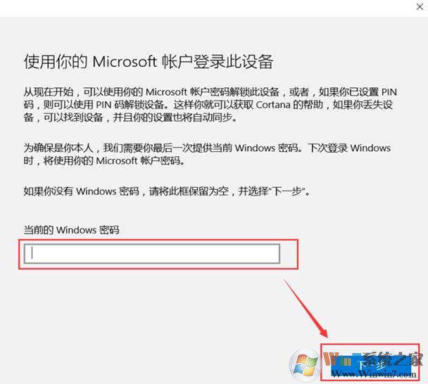 2、 在出現(xiàn)的頁面中輸入當(dāng)前微軟賬戶密碼,然后選擇“下一步”;