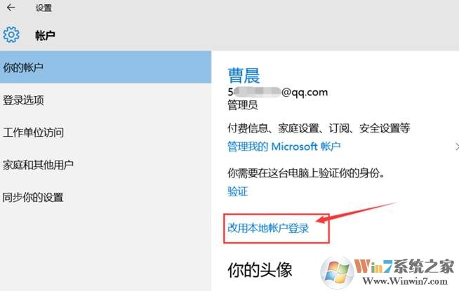 1、 在設(shè)置——賬戶——你的賬戶下選擇“改用本地賬戶登錄”,如圖: