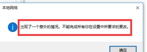 win10更改ip出現(xiàn)意外怎么辦?近端時間使用win10系統(tǒng)的用戶反應(yīng)在win10系統(tǒng)中想要修改IP地址的時候遇到了無法修改的現(xiàn)象,提示出現(xiàn)了一個意外情況 ,從而導(dǎo)致無法修改ip地址的現(xiàn)象,該如何解決呢?如下圖所示,我們可以看到:出現(xiàn)了一個意外的情況,不能完成所有你所設(shè)置中所要求的更改。